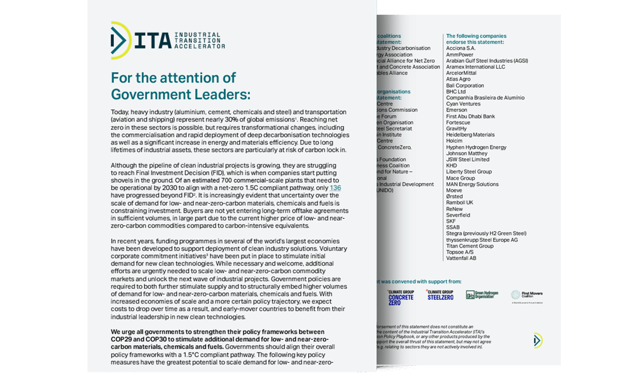 The ITA galvanises leaders from across industry, finance, and governments to scale the decarbonisation of heavy-emitting industries.